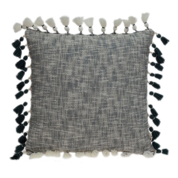 A versatile throw pillow can add all the style and comfort you need in your living room or bedroom, and this Slate Grey Throw Pillow excels in delivering just that. This is a woven pillow that has unique patterns and textures, adding a bit of style to your furniture. It is spongy and cushiony to provide you with ultimate comfort, and the black and white tassels all around enhance its playful look. 20” x 20” x 5”