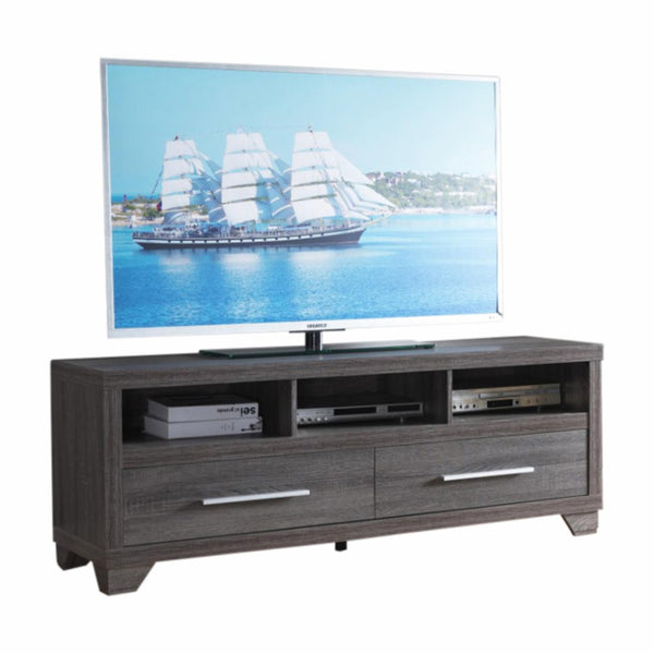 Complete your dreamy home space with this contemporary Sleek Grey TV Console Cabinet made from quality particle board professionally finished with a Melamine Laminate. This piece of furniture is a great option for the design conscious who appreciate quality construction that is pleasing to the eye. The elegant grey color of this TV stand adds to the gorgeous natural look of the peice, ensuring a contemporary and modern aesthetic for any interior that needs an update with minimalist, elegant and clean-lined furniture. This sleek console cabinet not only offers a durable construct and stylish design, but it also allows for ample storage room for all your entertainment area/living room items. The three open shelf setup with two quality sliding drawers adorned with high-grade metal handles provides the ultimate space for storage, making this TV stand the perfect option for your home entertainment setup! 21.75" x 71" x 15.25"