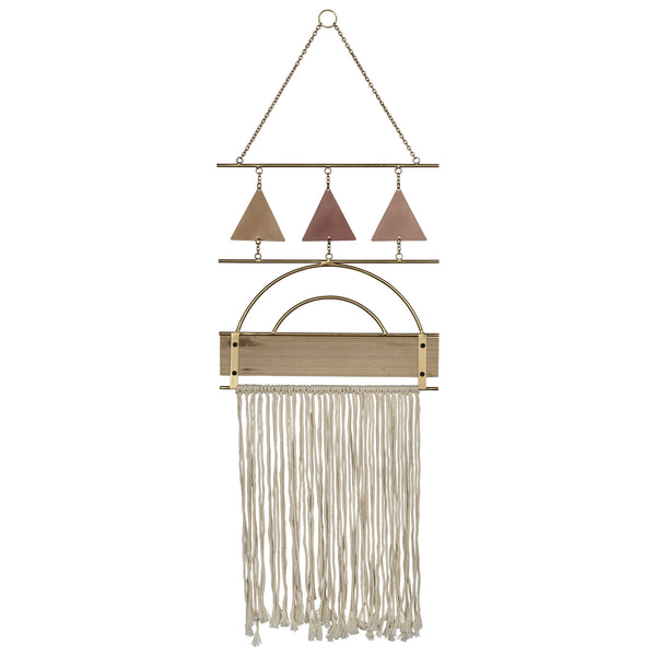 Boho-themed macrame pieces instantly add a certain coolness to your space. There's something magical about decor oozing with bohemian vibes that make them great pieces to have in any home.The Triple Triangle Macrame Wall Decor will add textural and visual appeal to your home. With its matte gold frame, natural wooden details, and soothing hues of pink, peach, and cream, this hanging decor will grab anyone's attention. It has a modern look to it that's balanced out by the graceful flow of the ropes hanging down. Made of 60% metal and 40% linen, this piece measures 11.81" W x 0.2" D x 33.86" H inches.
