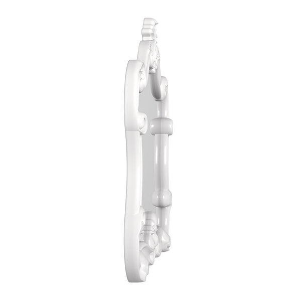 A lovely piece featuring an ornate, textured frame adorned with decorative flourishes. The entire piece is then finished in a glossy white lacquer. It is a perfect piece for an entryway, bathroom, bedroom, or any room in your home! This mirror can only be hung vertically. The glass of this piece is NOT beveled. It fits into a wide array of decor styles ranging from Traditional to Contemporary. It is great for kid's rooms too!