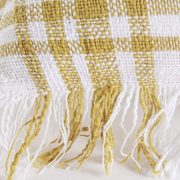 Bring a blissful bohemian aesthetic to your modern home with this White Gold Open Plaid Textured Throw Pillow that exudes a timeless traditional grace to pair well with any interior style. Crafted with care, the pillow is woven using white and gold cotton slub yarns to create an open plaid pattern that looks both simple and artisanal to allure the gaze. The pillow is both soft and durable, with a textured surface and self fringes that give the pillow a handcrafted visual appeal. The back of the pillow comes in a matching solid cotton fabric with a hidden zipper closure for ease of fill and cleaning. The polyfill insert ensures a fluffy look with a soft and cozy feel at the touch. Beautifully designed with a heathered appearance, this decorative pillow is a true representation of authenticity and simplicity tied together by modern minimalism. 18” x 18” x 6”