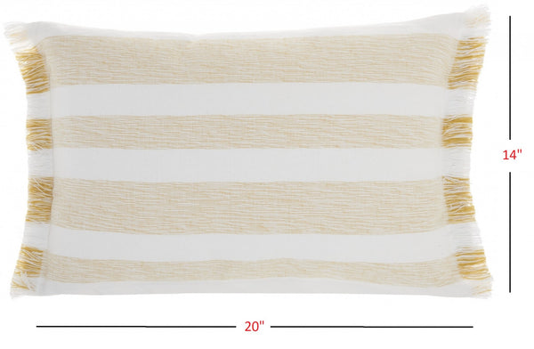 Induce a sense of warmth and coziness into your place with this Golden Yellow and White Soft Stripes Throw Pillow that flaunts a relaxed and laid-back feel in its simplicity. Showcasing clean-lined alternating stripes in pastel hues of yellow ochre and creamy white in the middle with ornamental fringes on the edges gives off a farmhouse appeal. Made to stand the test of time, this 100% cotton-made pillow is super durable, easy to clean, and more breathable. Pair this soft and sumptuous throw pillow with neutral shades or vibrant hues for a blissful harmony or a striking contrast. 14” x 20”x 5"